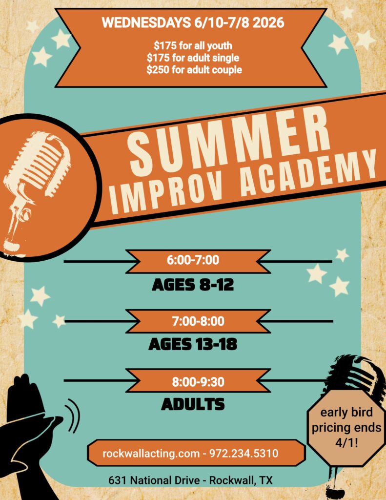 Join Mr. John Rawley for a 5 week summer improv intensive. Learn some improv basic skills and build on those to play improv games in a supportive environment that builds confidence and helps with life skills like public speaking, empathy, and grit. All classes will perform in a show off on the last week of the academy. Adult classes will have the opportunity to perform with Mr. John’s DFW metroplex adult improv group (optional).